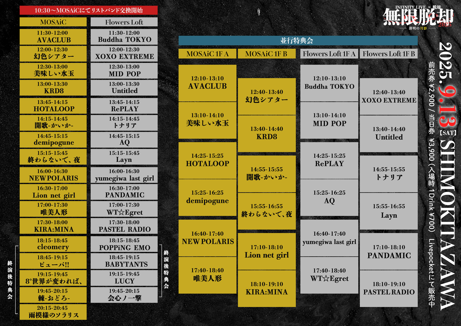🕰 リストバンド交換:MOSAiCにて11:00開始(予定)